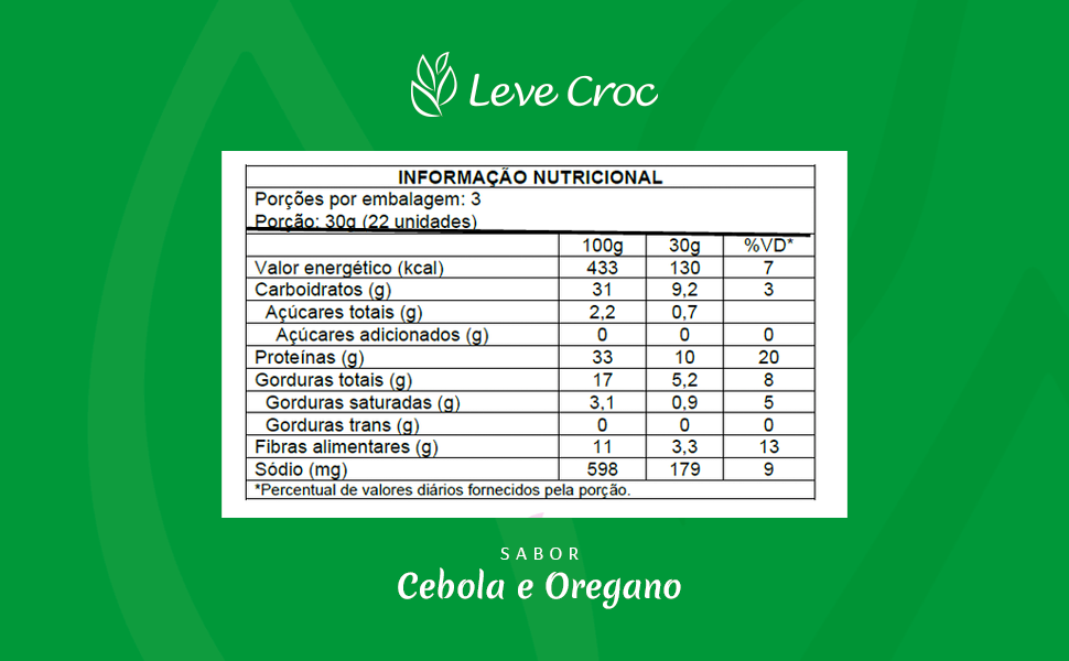 INGREDIENTES: Mix de proteínas (ervilha+arroz), farinha de grão de bico, azeite de oliva extravirgem, fécula de batata, fécula de mandioca, polvilho azedo, polidextrose, chia, lecitina de girassol e/ou lecitina de soja não-transgênica, cebola, sal marinho integral, gengibre, açafrão (cúrcuma), alho, goma guar, goma xantana, óleo essencial de orégano, fermentos químicos bicarbonato de amônio e bicarbonato de sódio, aromatizante natural extrato de alecrim, acidulante ácido cítrico. ALÉRGICOS: CONTÉM DERIVADOS DE SOJA E PODE CONTER AMÊNDOAS. NÃO CONTÉM GLÚTEN. NÃO CONTÉM LACTOSE.